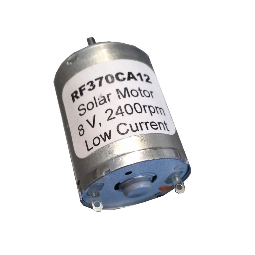 DOWNLOAD COMMERCIAL SPECIFICATIONS REPORTThis is a low speed, low current, medium torque DC motor. Rated for 8 Volts DC; but it operates safely with 4.0 V up to 12 V. This small electric motor can be used for toys, hobbies, science and technology experiments, robots, automation and many more. It has two electrical contacts in the back that may be used to plug a connector or simply attach wires with or without soldering. The shaft is 2 mm in diameter and about 10 mm in length. Because of very low current requirement, RF370CA motors can easily operate with small batteries and solar panels. Quiet and smooth operation of this motor makes it a perfect choice for indoor and long hours of operation.